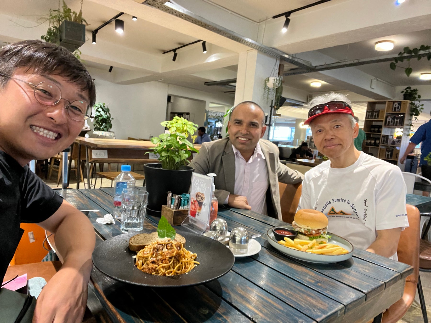 ▲(左)代表の都築(中央)Ram氏(右)2024年大会完走の南氏〔ネパールカトマンズのHimalayan Java Coffeeにて]