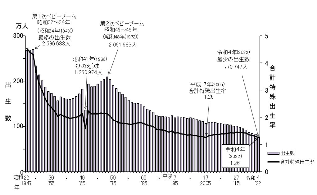 厚生労働省の調査結果によると、2022年の出生数は過去最少(※)でした。このままの状態が続くと、現在の日本人口の1/3が将来消えるという予測もあります。