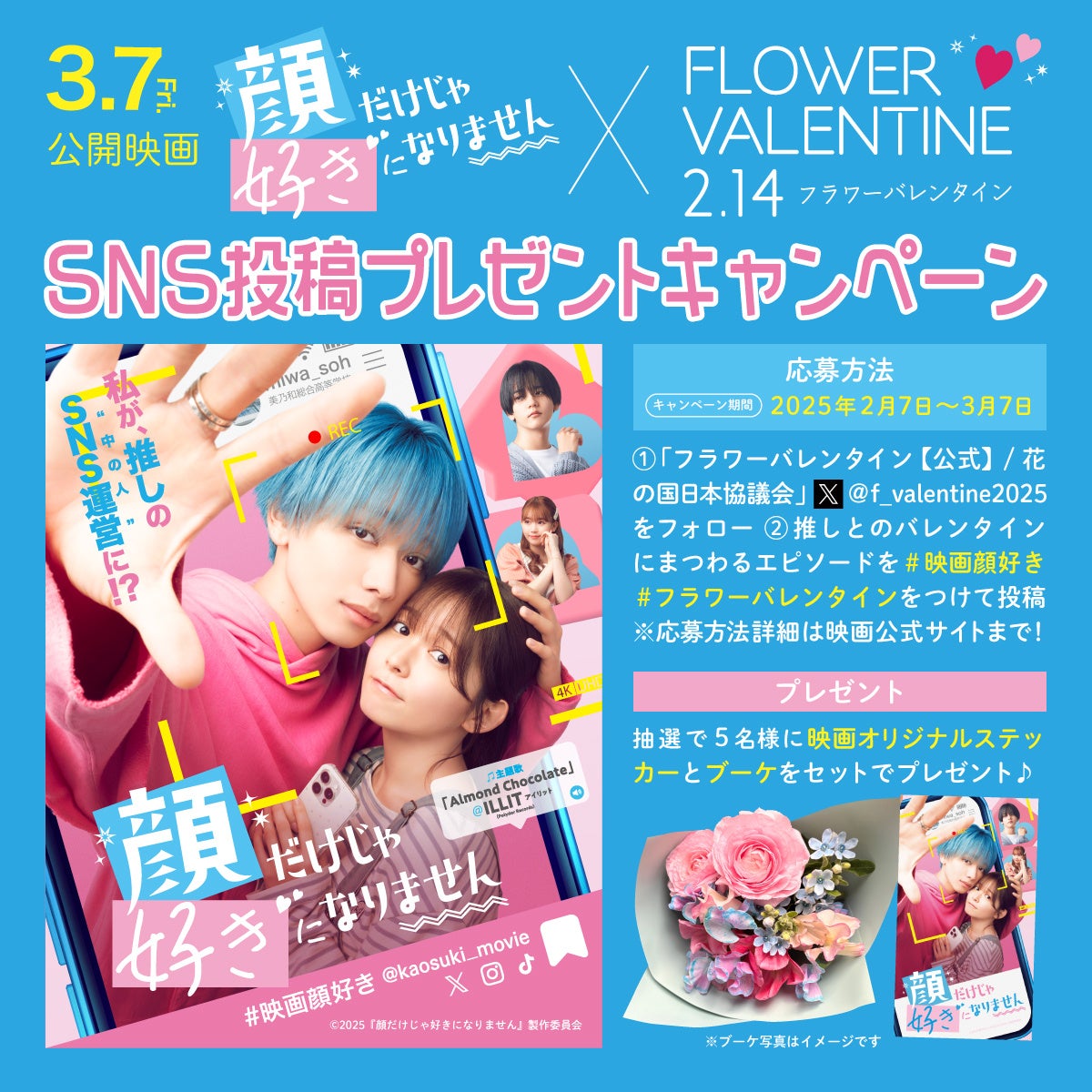 累計180万部を突破し、ティーンに絶大な支持を誇る少女コミック『顔だけじゃ好きになりません』(『花とゆめ』連載中)の実写映画とのタイアップが決定。本作は、韓国の人気ガールズグループ ILLIT(アイリット)が主題歌を担当することでも話題になっています。このコラボでは、「推し活×バレンタイン」をテーマに、SNS(X)での投稿キャンペーンを実施。主人公の青髪男子・奏人先輩(宮世琉弥 演)をイメージしたブーケと、映画オリジナルステッカーを抽選で5名様にプレゼントします。