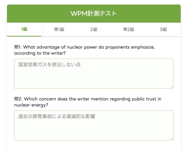 1級受験者は大学レベル以上の語彙・文法力が必要。WPMテストを何度も反復することで、速く読む力+正確理解を同時に育成し、厳しい試験時間内で効率よく問題をこなせるようになります。