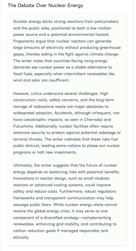 読み終えた後に表示される設問は英語で書かれており、ユーザーは英語の質問を解釈した上で日本語で回答します。これは「単語を拾って安易に答える」ことを防ぎ、英文の要点を自分の言葉でまとめることを必須とするため、単なる単語コピーや推測回答がほぼ不可能となります。
