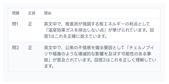 設問文が英語なので「表面的に単語を拾って推測」できそうに見えますが、答えを日本語で書く必要があるため、「英語の単語をそのままコピペして回答」はできません。正しい意味を理解し、自分の日本語に変換する工程が欠かせない仕掛けです。