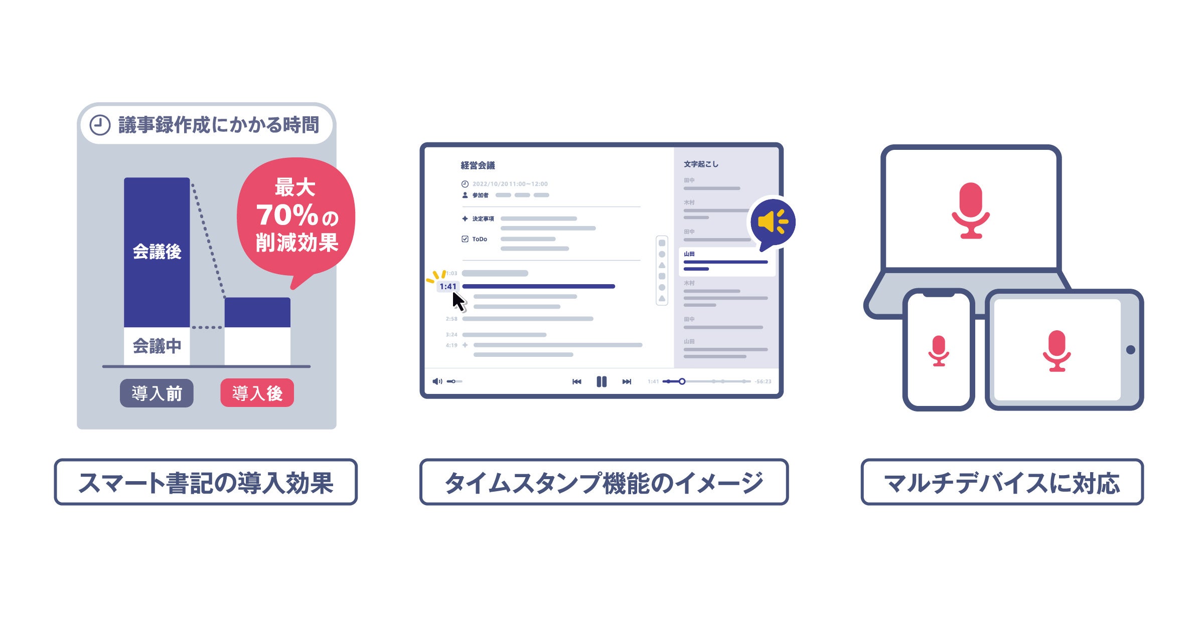 スマート書記は、AIと音声を活用して議事録の作成・共有・管理ができるクラウドサービスです。その特徴と効果は以下のとおりです。