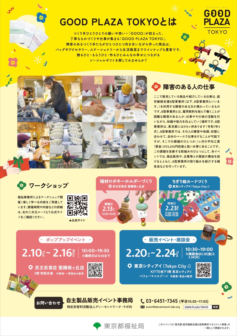 特定非営利活動法人ディーセントワーク・ラボ(東京都大田区、代表理事:中尾文香)は、東京都の就労継続支援B型事業所(以下、B型事業所)のものづくりや活動を紹介する自主製品販売イベント「GOOD PLAZA TOKYO」を今年も企画・運営いたします。