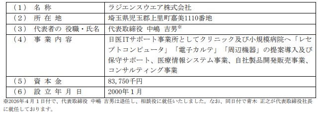 当社は、2026年3月19日開催の取締役会において、ラジエンスウエア株式会社(本社:埼玉県児玉郡、 代表取締役 中嶋 吉男、以下、ラジエンスウエア社)の普通株式の100%を取得(以下、本株式取得) し、子会社化することを決議いたしました。その後、2026年4月1日に同社本株式を取得し、子会社化を完了しましたので、お知らせいたします。なお、同日付で代表取締役 中嶋 吉男は退任し、相談役に就任 いたしました。