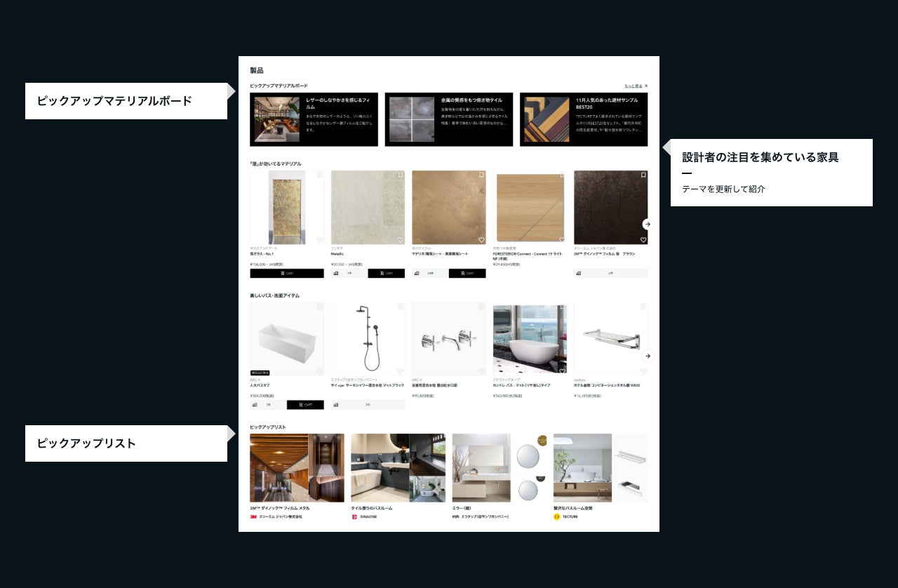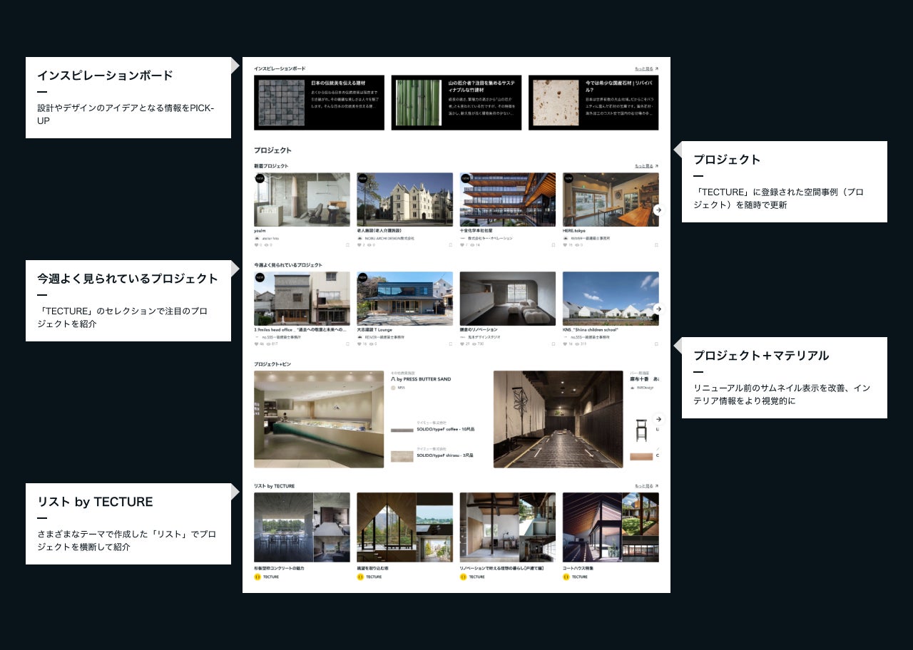 今回のリニューアルでは、TECTUREが運営する空間デザインメディア『TECTURE MAG』に掲載された新着ニュースもあわせて紹介。業務に必要なトレンドのキャッチアップ・ビジネス情報へのアクセスをよりシームレスなものとし、サービス間の連携を強めました。