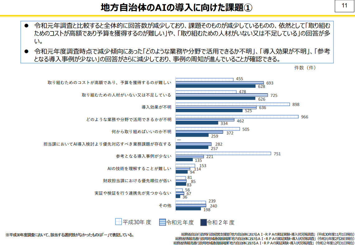 総務省発行の「自治体におけるAI・RPA活用促進」データによると、令和2年度の地方自治体のRPA導入に向けた課題として一番多くあげられたのは「取り組むための人材不足」、次いで「コストが高額で予算の獲得が難しい」でした。