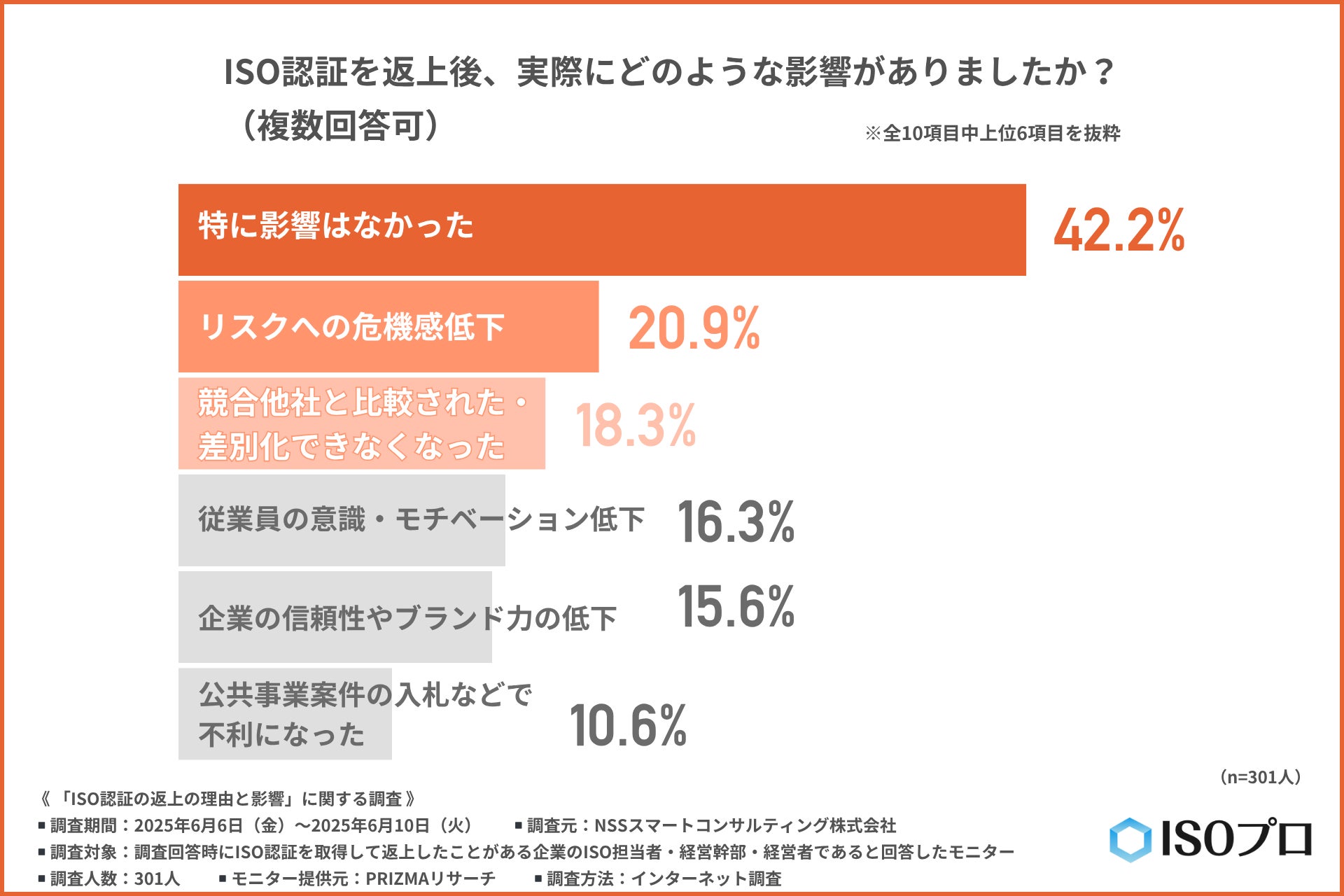 「ISO認証返上後の影響」について尋ねたところ、『特に影響はなかった(42.2%)』が最も多く、『リスクへの危機感低下(20.9%)』『競合比較・差別化困難(18.3%)』と続きました。