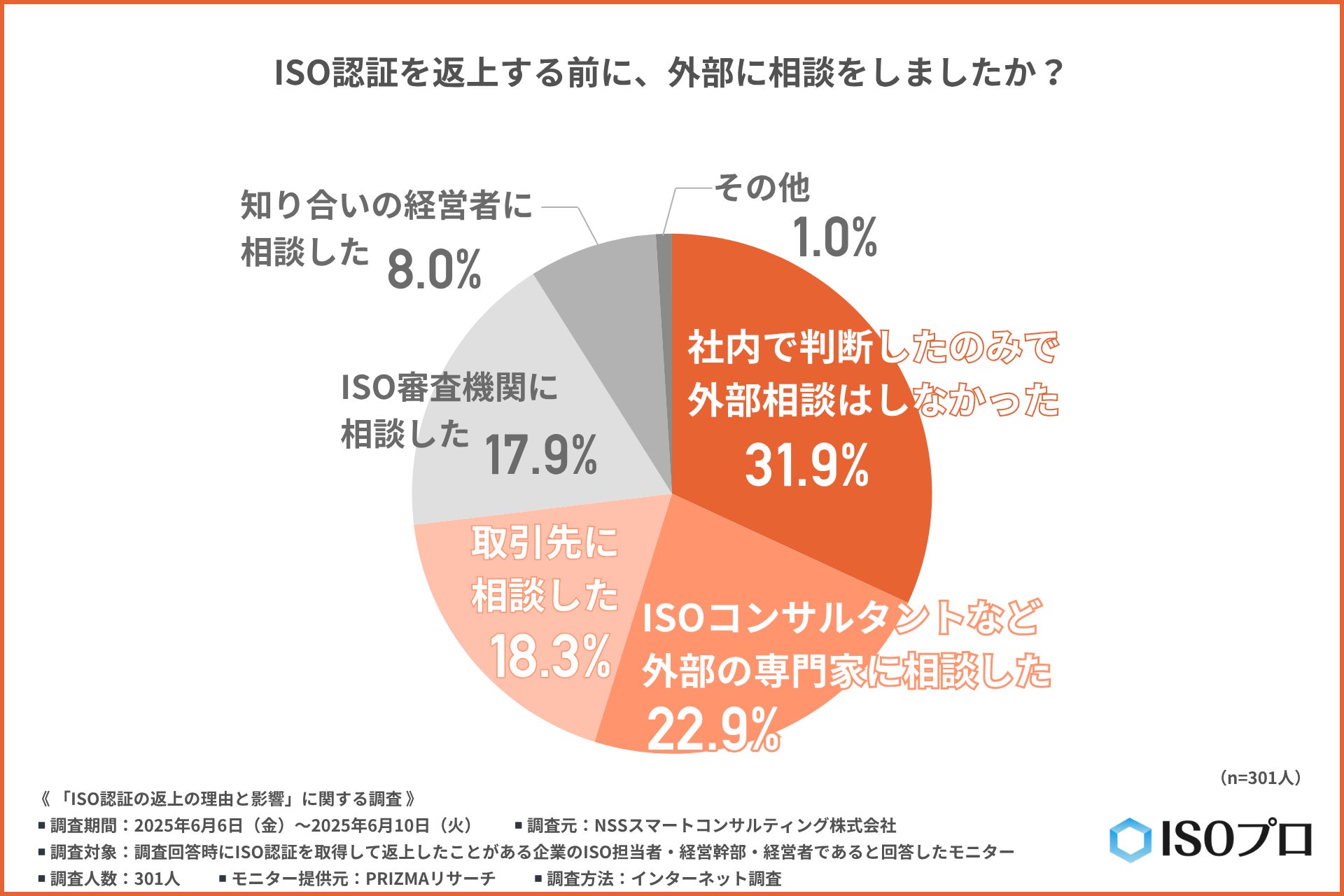 返上にあたっては、ISOコンサルタントなど外部の専門家や取引先に相談して意思決定を行ったケースも一定数見られましたが、社内のみで判断した企業が最も多く、効果的な運用方法や返上後の影響についてなど、十分に相談しないまま判断に至った可能性もうかがえます。