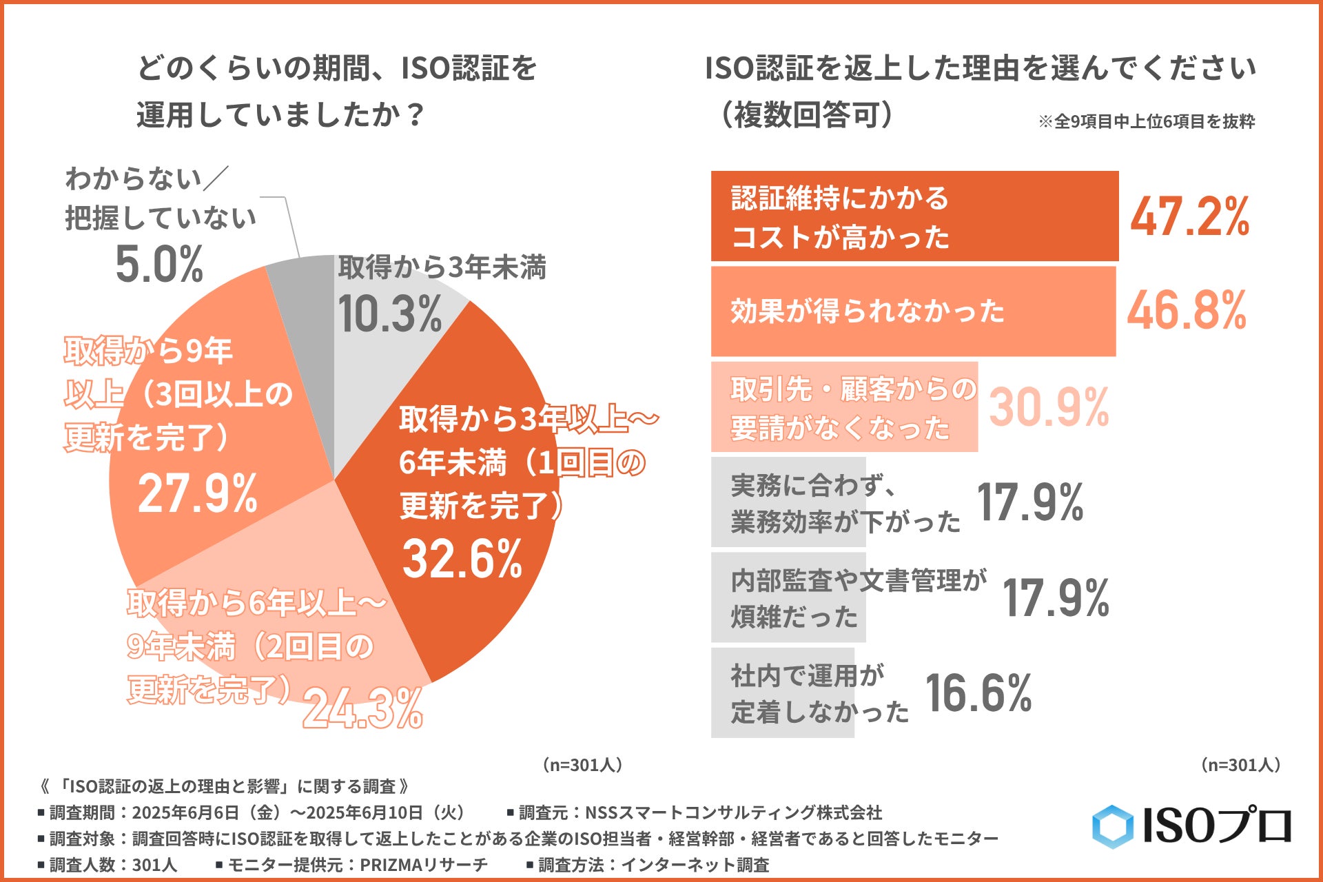 そこで今回、各種ISOの新規取得・運用サポートサイト『ISOプロ』(https://activation-service.jp/iso/)を運営するNSSスマートコンサルティング株式会社は、ISO認証を取得して返上したことがある企業のISO担当者・経営幹部・経営者を対象に、「ISO認証の返上の理由と影響」に関する調査を実施しました。