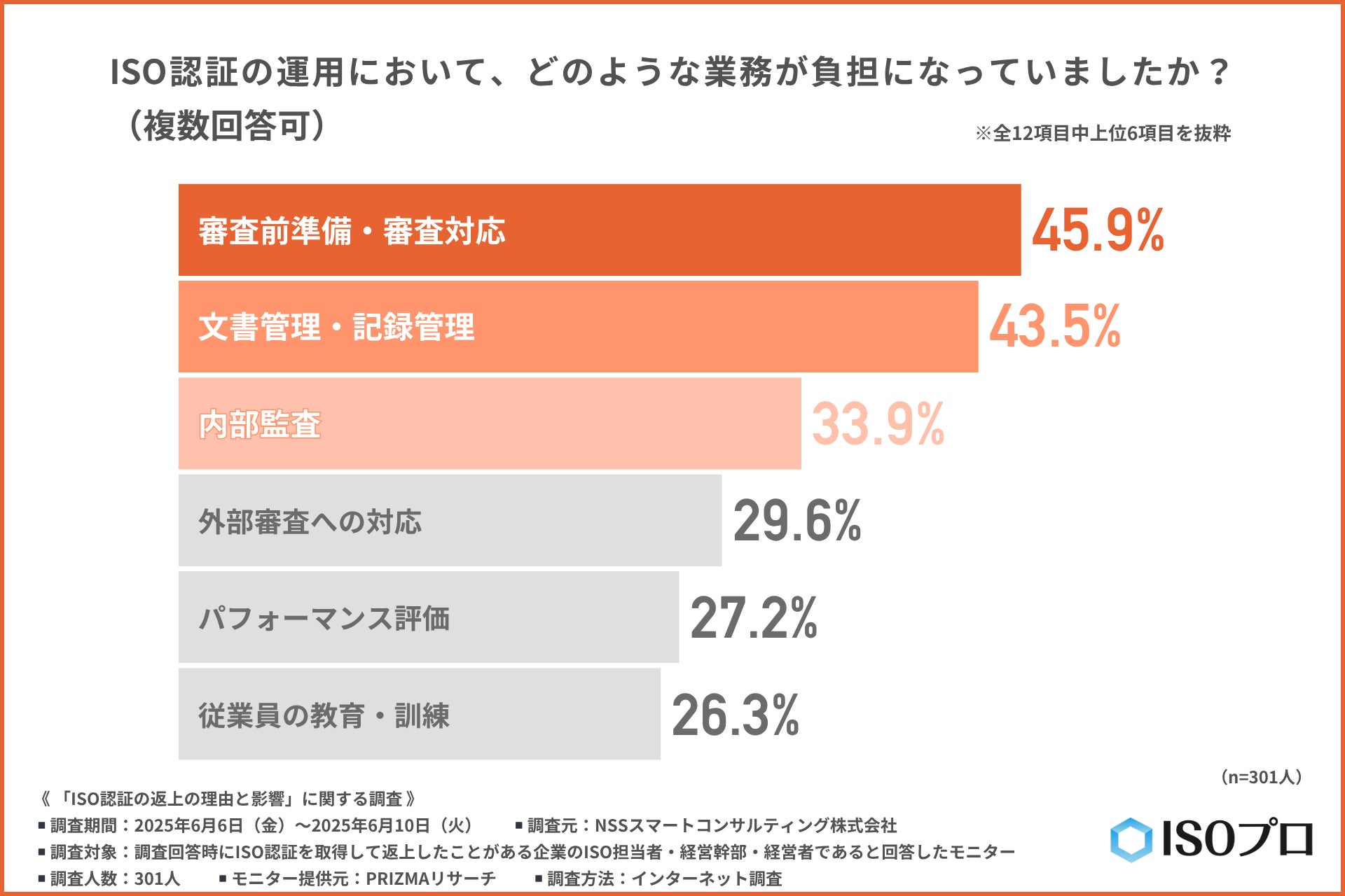 「ISO認証の運用における負担業務」について尋ねたところ、『審査前準備・審査対応(45.9%)』が最も多く、次いで『文書管理・記録管理(43.5%)』『内部監査(33.9%)』となりました。