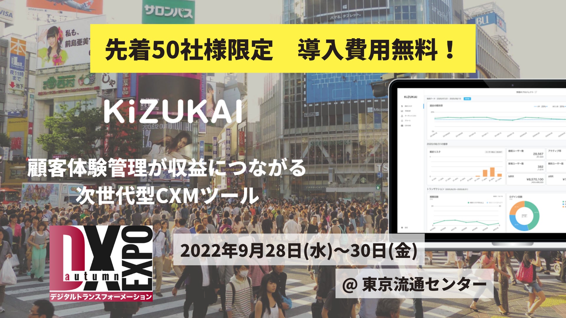 顧客体験管理を収益につなげる次世代型CXMツールを提供する株式会社KiZUKAI(本社:東京都新宿区 代表取締役:山田 耕造)は、2022年9月28日(水)から30日(金)まで東京流通センターで開催される第2回 DX EXPO【秋】に出展、同展示会にて前回好評の『KiZUKAI』導入費用無料キャンペーンを実施いたします。