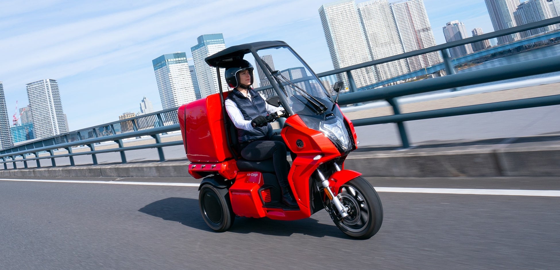 安定性の高い3輪構造、大型スクリーンとルーフ、独立懸架リアサスペンション、大径ホイールという独自の車体構成により、従来のビジネスバイクが持つさまざまな課題を解決する、電動3輪バイクです。