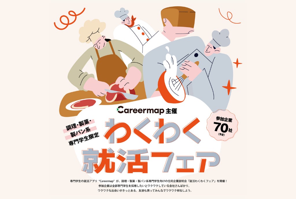 専門学生向け就活アプリ「Careermap」を運営する株式会社グッドニュースは、調理・製菓・製パン系専門学生を対象とした合同企業説明会『わくわく就活フェア』を2025年3月4日(火)に大阪のハービスホールで開催いたします。本イベントは、専門職を志す学生と業界の有力企業が一堂に会する、日本最大級の就活フェアです。