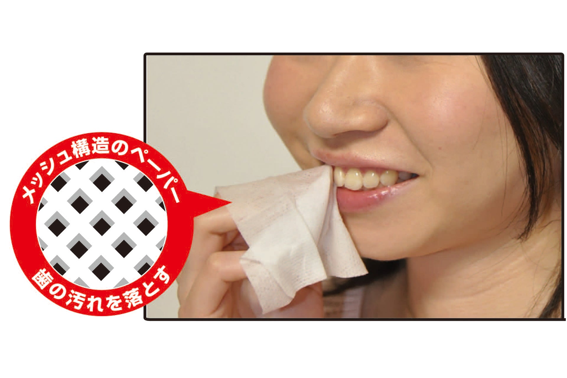 「ペーパー歯みがき」は弊社が様々な試行錯誤を経て開発し、2002年の新発売以来、20年以上にわたり多くの方々にご愛用いただいています。使用方法は液剤が染み込んだメッシュ構造のシート状のぺーパーで歯を拭くだけなので、大変簡単で、ペーパーが口臭、歯垢、虫歯の原因となる食べ物のカスや細かな汚れを取り除きます。キシリトール・茶エキス配合、クールミント味で口内はすぐに爽快、歯磨き同様にリフレッシュします。