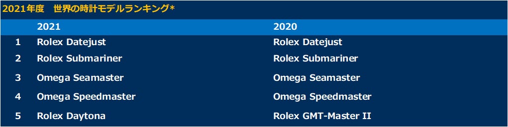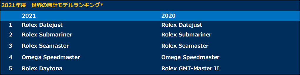 昨年度に引き続き、2021年も1位にRolexのDatejust、2位にRolexのSubmarinerがランクイン。2020年は、GMT-MasterⅡが4位にランクインしていましたが、2021年度ではDaytona(デイトナ)がシェアをあげ、5位にランクインしました。