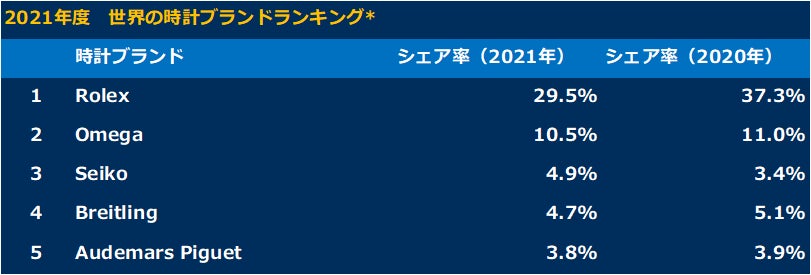 2021年上半期時点で4.3%までシェア率を伸ばし、4位にランクインしていた日本ブランドのSeikoは、最終的に4.9%にまでシェアを広げ、3位にランクインしました。