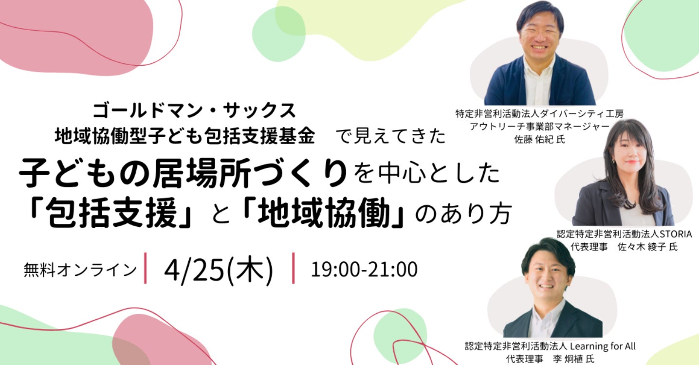 ゴールドマン・サックス支援金をもとに”地域全体を巻き込んでの子どもへの支援”に挑戦したNPOが登壇!「子どもの居場所づくりを中心とした『包括支援』と 『地域協働』のあり方」を4月25日に開催