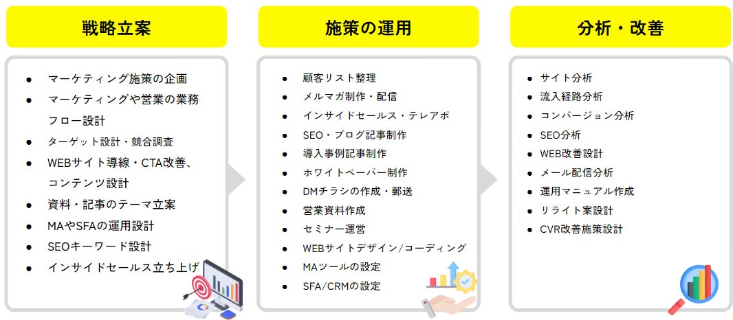 そこで当社は、マーケティングに本格着手できていないBtoB企業を支援するために、マーケティング業務を丸ごと代行するサービスを提供することにしました。これにより、マーケティング担当がいない企業でも、オンライン・オフラインを問わず事業成長に必要なあらゆる施策を企画から実行、分析まで着実に遂行し、良質なリード・商談を増やすことが可能になります。