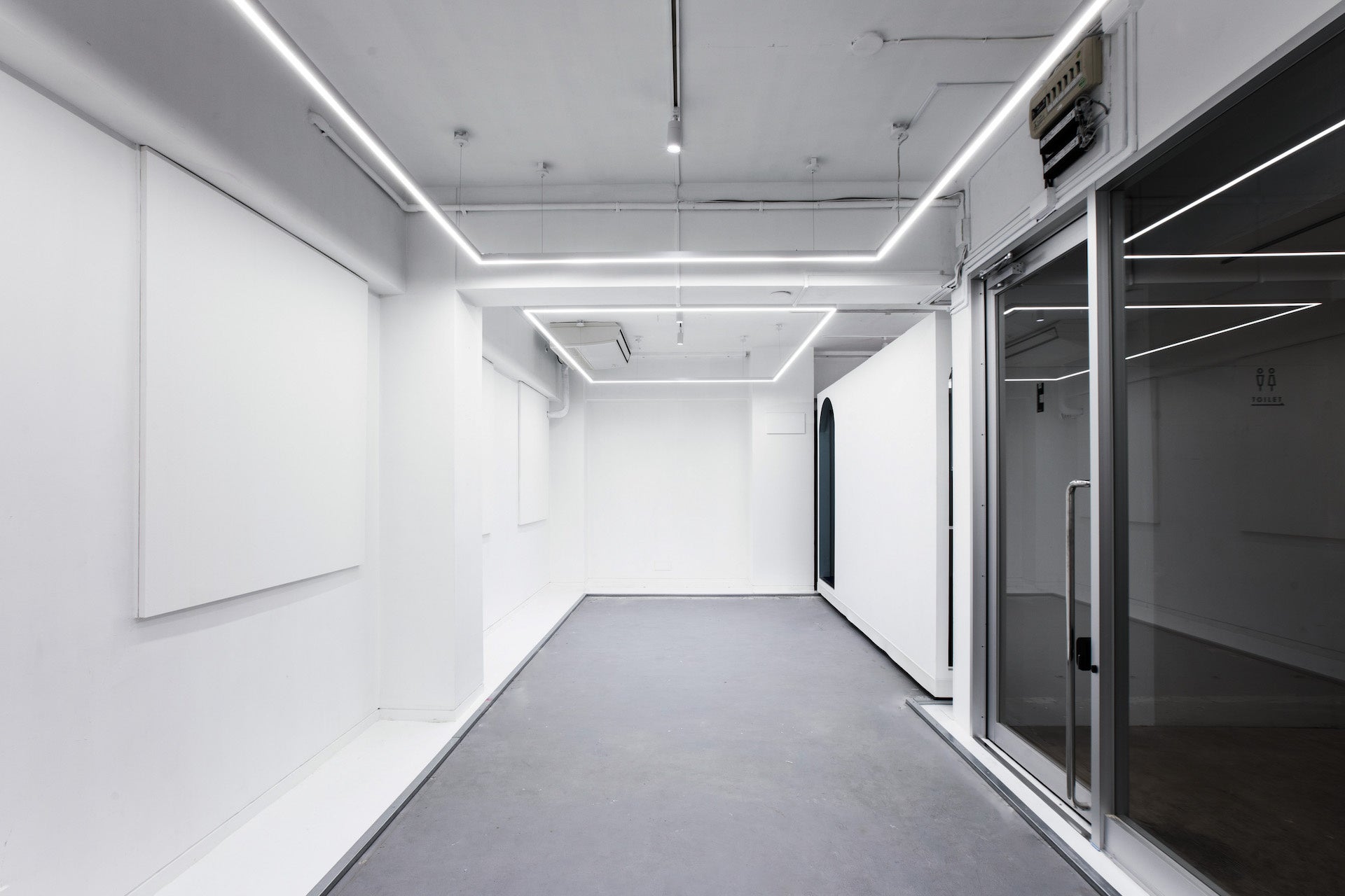L字の間取りを箱型の部屋が可動する構造により、撮影スタジオとして、会議や執務スペースとして、展示スペースとしてなど、幅広い用途を実現させます。