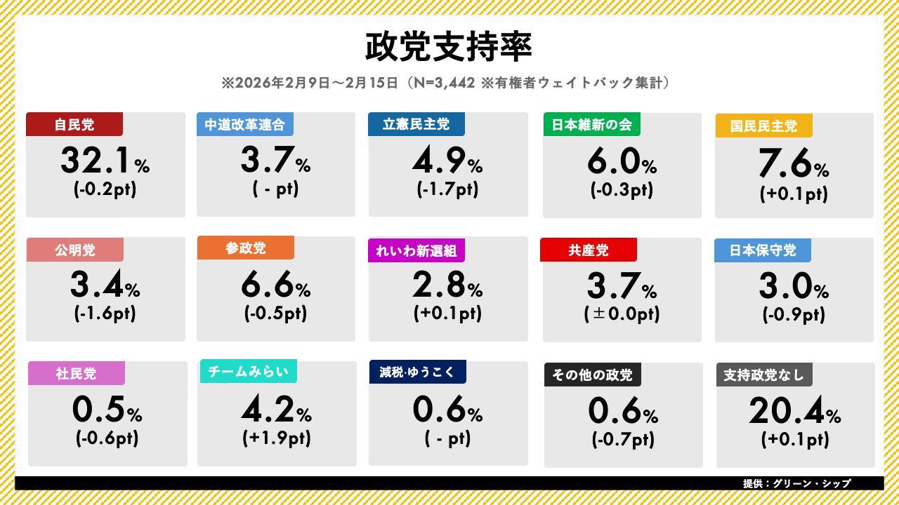ジャッグジャパン株式会社(本社:東京都渋谷区)は、株式会社グリーン・シップ(本社:東京都千代田区)と業務提携し、グリーン・シップが提供する日次世論調査「世論レーダー」のデータを提供しております。本日、2026年2月第3週(2月9日〜2月15日分)の内閣支持率・政党支持率調査の結果を発表いたします。