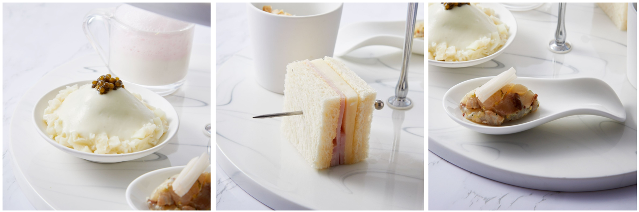 “ホワイトチョコアップル”のウェルカムドリンクをはじめ、“レアチーズケーキ”や“アールグレイのプリン”など、こだわりの食材で作り上げた純白の世界を、アートのように美しいスイーツでお楽しみいただけます。下段のセイボリープレートももちろん白一色。“クラムチャウダー”や“カニとトリュフの玉子サンド”等、白にこだわったメニューが並びます。