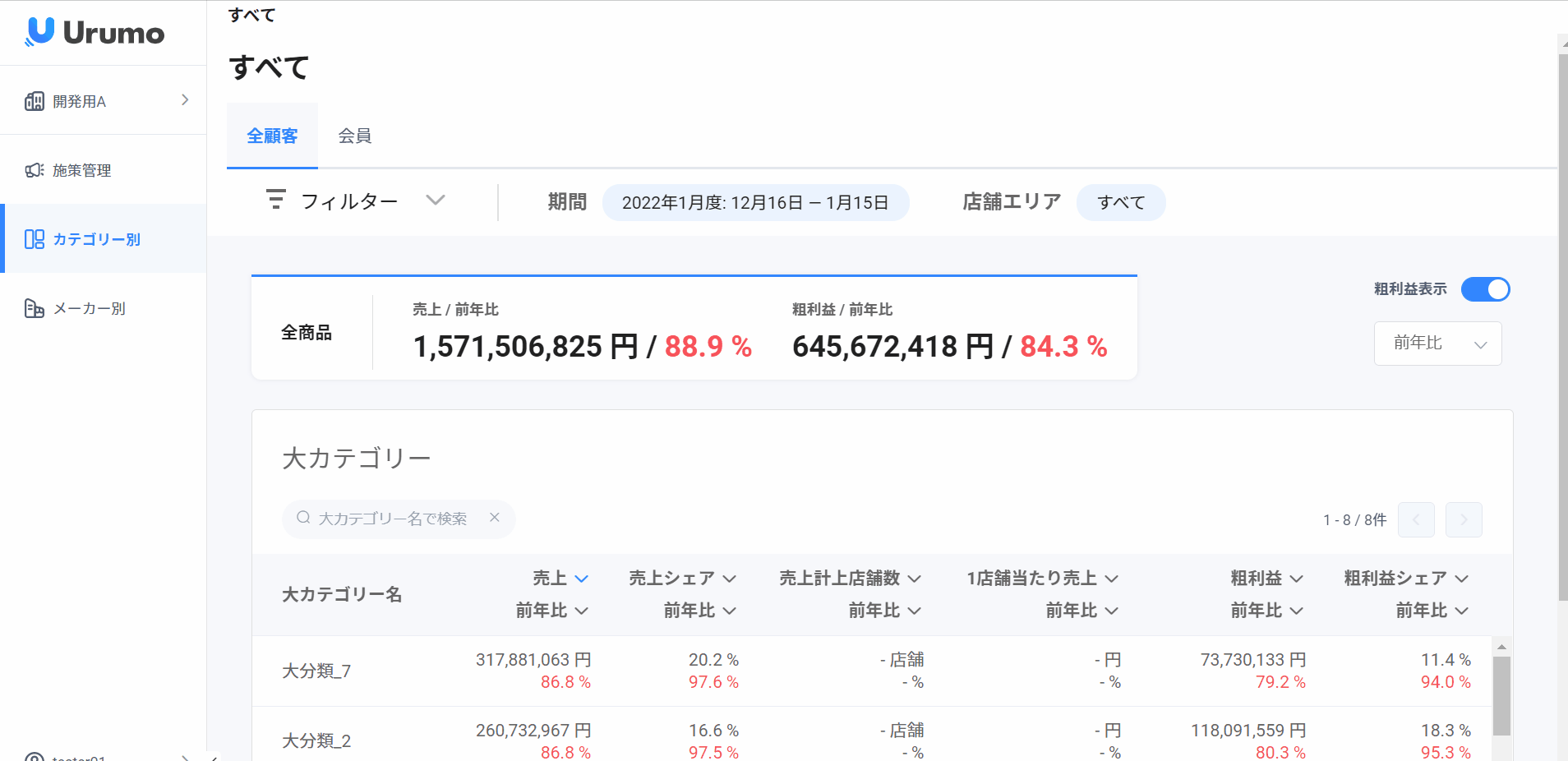 「Urumo Shopper」では、ID-POSを基にしたカテゴリー別・メーカー別・ブランド別の売上・粗利データをはじめとし、購入金額、購入数量、購入者数などへの要素分解や新規購入・リピート購入分析データなどの基本的な分析指標を即座に表示することができます。