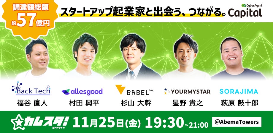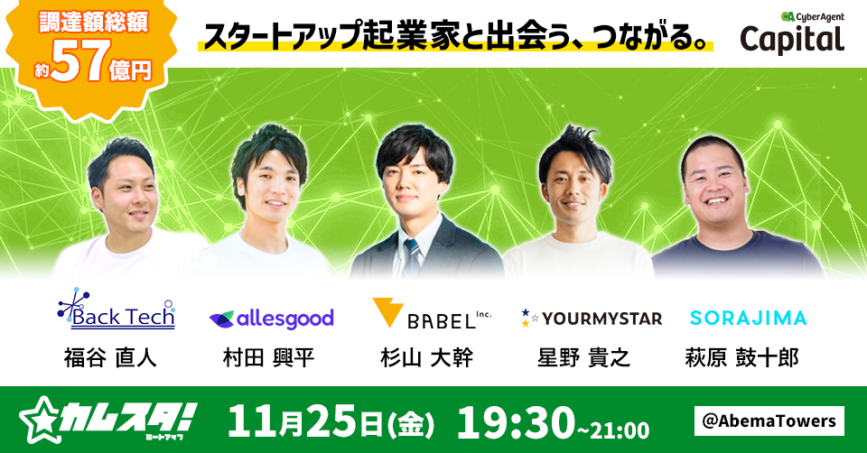 サイバーエージェント・キャピタルおよびサイバーエージェント(藤田ファンド)投資先の代表、経営陣、人事担当者が参加。累計調達額約57億円となる、急成長中のスタートアップ5社を集めました。