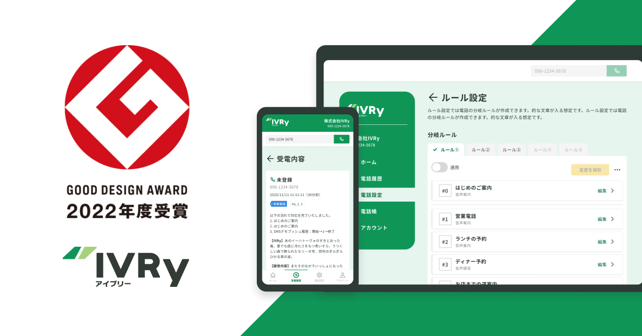 株式会社IVRy(本社:東京都台東区、代表取締役CEO:奥西 亮賀、以下「当社」)が提供する電話自動応答サービス「IVRy(アイブリー)」が、このたび2022年度グッドデザイン賞(主催:公益財団法人日本デザイン振興会)を受賞いたしました。