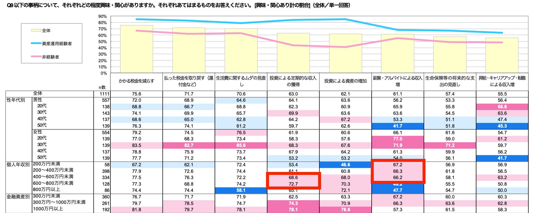 年収や金融資産が増えるほど、資産形成・資産運用への興味・関心度が高くなる