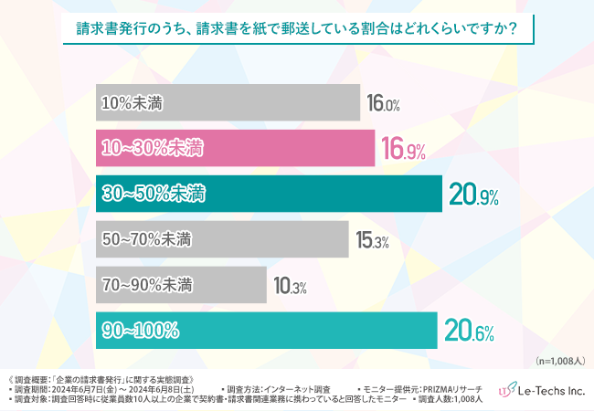 「請求書発行のうち、請求書を紙で郵送している割合はどれくらいですか?」と質問したところ、『30〜50%未満(20.9%)』と回答した方が最も多く、次いで『90〜100%(20.6%)』『10〜30%未満(16.9%)』と続きました。