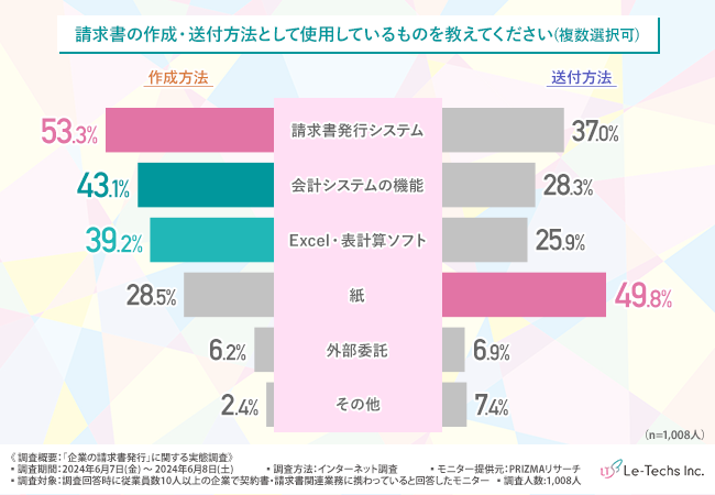 請求書の作成方法は請求書発行システムの使用が53.3%で最多。一方で送付方法は紙の使用が49.8%と最多