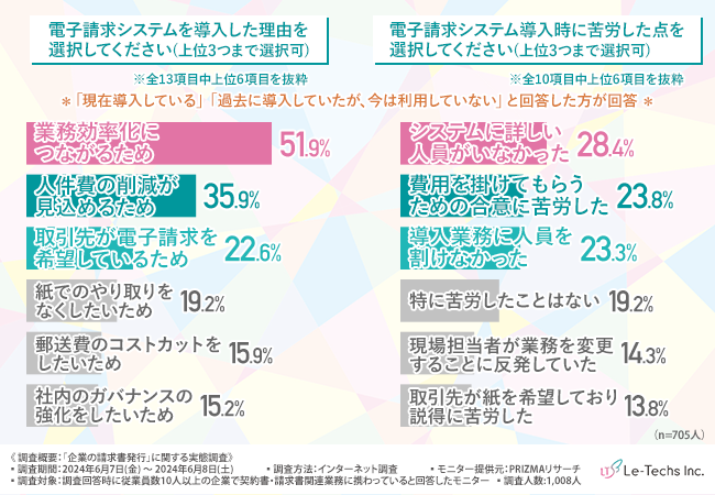 約半数が、業務効率化を目的に電子請求システムを導入したことが明らかになり、さらに、人件費の削減や取引先の希望にあわせて導入したことが示されました。