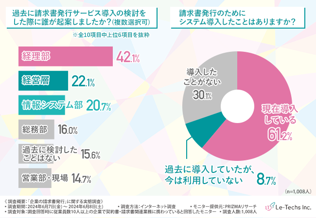 次に、「請求書発行のためにシステム導入したことはありますか?」と質問したところ、『現在導入している(61.2%)』『過去に導入していたが、今は利用していない(8.7%)』『導入したことがない(30.1%)』と続きました。