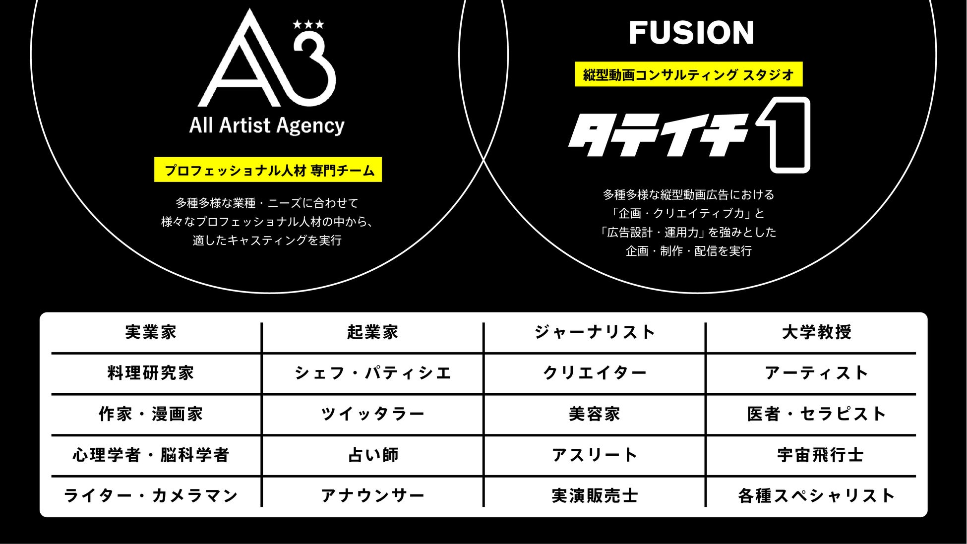 「デジタル」と「クリエイティブ」を掛け合わせ「新しい問いを立て、新しい答えをつくる。」デジタルエージェンシー、株式会社FUSION(本社:東京都渋谷区、代表取締役:前田遼介、以下FUSION)は、世界の才能をつなぐプロフェッショナルをミッションに総合キャスティング事業を展開する株式会社エイスリー(本社:東京都渋谷区、代表取締役CEO:高橋 太一、以下エイスリー)と協同で新たなプロジェクトを始動します。FUSIONが運営する縦型動画コンサルティングスタジオ「タテイチ」とエイスリーが運営する「プロフェッショナル人材専門チーム」とのコラボレーションにより、消費者や広告主に意義のある、縦型動画広告を提供します。