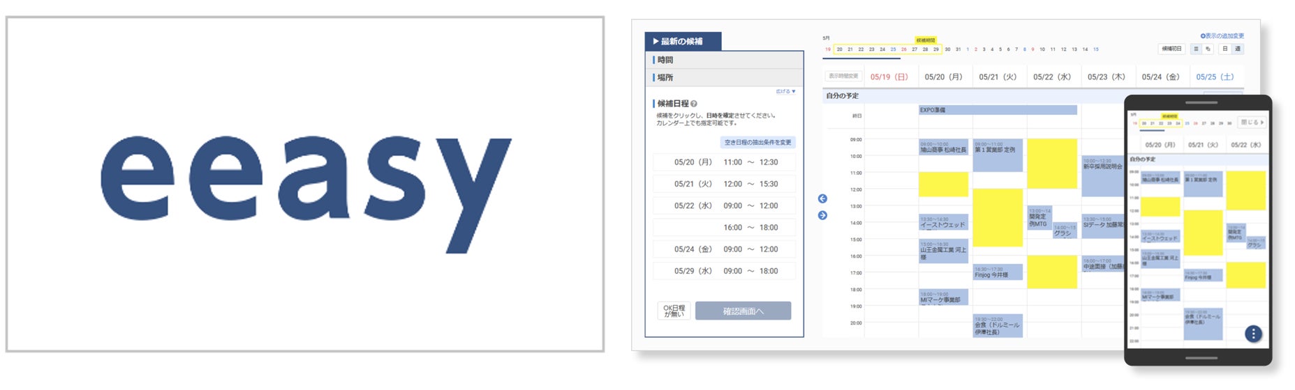 eeasyは、Googleカレンダー・Outlook予定表と連携することで、空き日程を自動判定し、ビジネス上の日程調整を自動化・効率化するサービスです。そして、IT先進国である米国を本拠とする世界的メディアから、機能性・利便性・革新性・顧客満足度などの総合評価で「No.1日程調整ツール」の称号を受賞した「日本No.1」「世界最高峰」の日程調整ツールでもあります。( https://eeasy.jp/ )