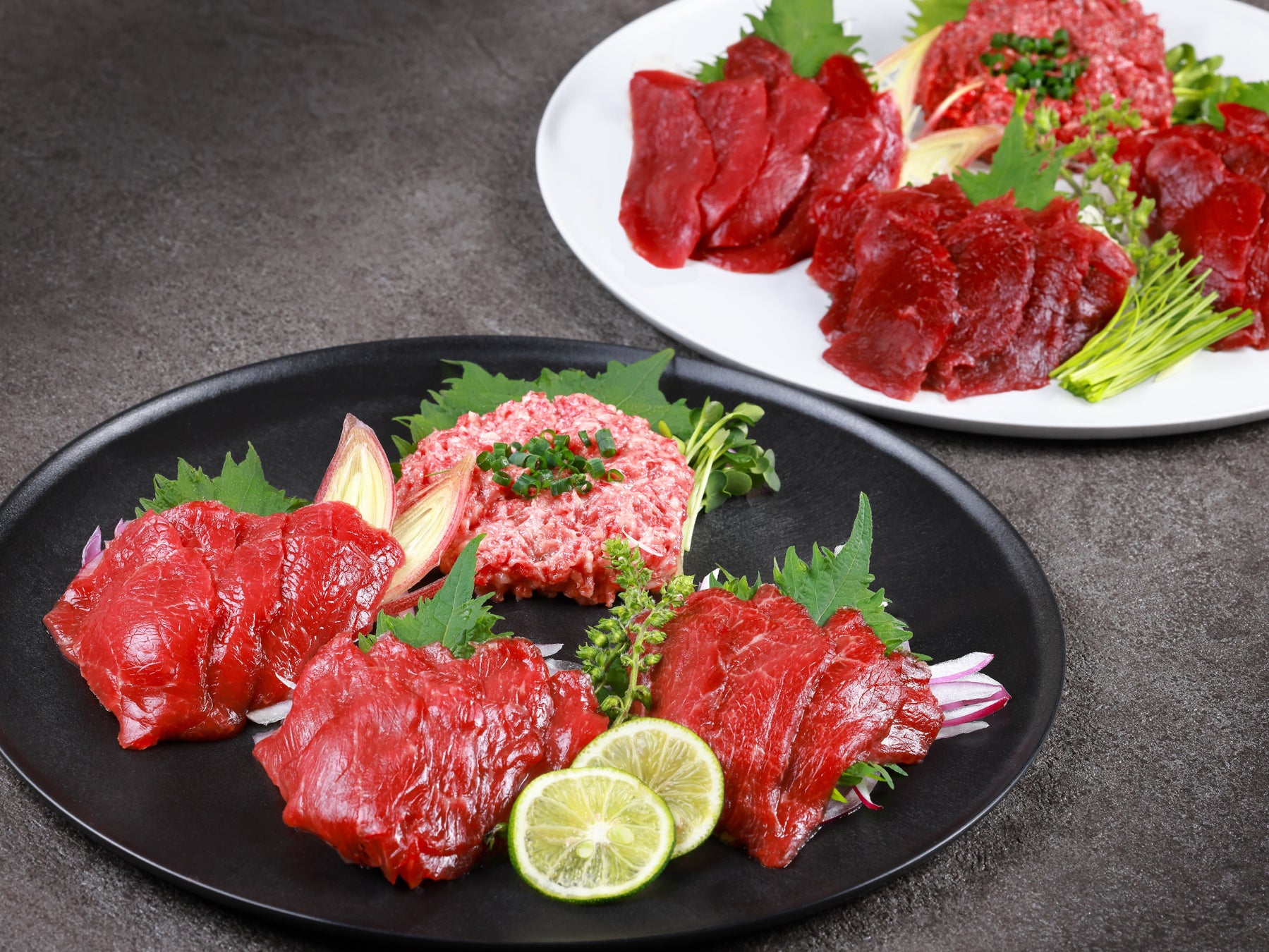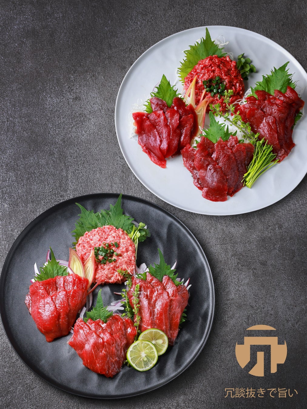 馬刺しになる馬には、ほどよく脂肪の入った「ノルマン種(重種馬)」と、より筋肉質で低脂肪な「国産馬(軽種馬)」という2種類の馬があります。前者はコクがあってふくよかな旨みのある味わい、後者は脂質がなくあっさりとした味わいです。それぞれに特長がある馬種の馬刺しを、さらに部位で絞り込むことで「冗談抜きで旨い」を実現しています。