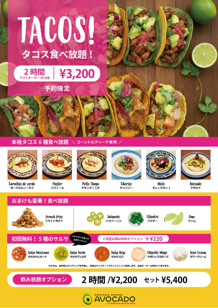 内容: 当店自慢のタコス6種([具体的な種類:ポークカルニータス、パストール、チキンティンガ、チョリソ―、チキンモレ、アボカド])が制限時間内でおかわり自由。
