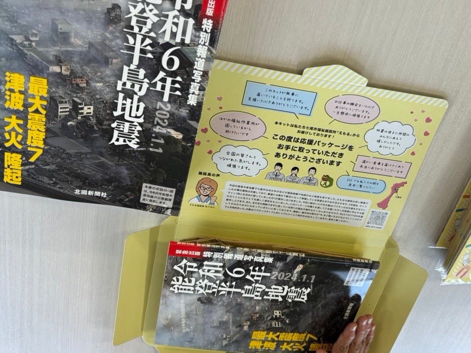 支援の形を模索する中で、被災地に物資支援やイベント開催など活動を行ってまいりました。その中で北國新聞社出版「令和6年能登半島地震特別報道写真集」を知り、現地の様子をより多くの方に知っていただき風化させないこともまた一つの支援のあり方だと考え、この度報道写真集付きパッケージを100キット販売する運びとなりました。専用回収キットの制作・発送は被災地のB型就労支援福祉作業所「えもる」が担当し、オリジナルパッケージを購入者のお客様の元へ届けます。