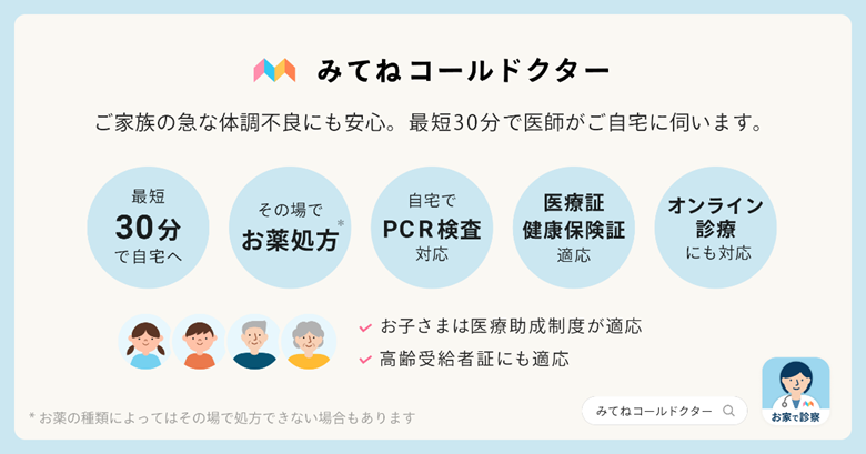 「みてねコールドクター」は、最短30分で自宅に医師を呼ぶことができる、健康保険が適用可能な夜間・休日の往診アプリ※1です。アプリから簡単に依頼でき、医師がご自宅に伺い診察※2、その場でお薬をお渡しします※3。また、「夜間・休日に限らず相談したい」というご要望にお応えして、24時間365日対応※4のオンライン診療や医療相談も提供しています。医療相談は無料でご利用いただけ、相談後に往診やオンライン診療をご依頼いただくことも可能です。あらかじめアプリをインストールし、ご自身やご家族の情報を登録しておくと、急な体調不良時も慌てず安心。経験豊富な約400名の医師が、あなたとご家族の健康をいつでもサポートします。