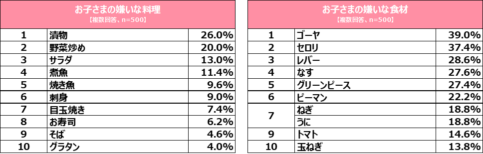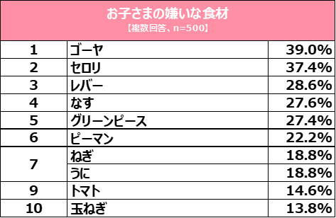 また、お子さまの嫌いな食材をTOP5まで見てみると、1位は「ゴーヤ」で39.0%、2位は「セロリ」で37.4%、3位は「レバー」で28.6%、4位は「なす」で27.6%、5位は「グリーンピース」で27.4%という結果となりました。