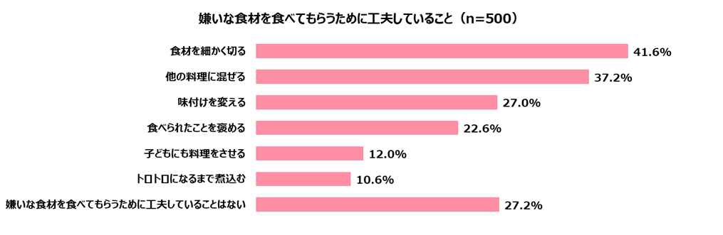 嫌いな食材を食べてもらうためにしている工夫として最も多かったものは「食材を細かく切る」で41.6%、次いで「他の料理に混ぜる」で37.2%、「味付けを変える」で27.0%という結果でした。また、工夫していないと答えた方は27.2%にとどまり7割以上の方が様々な工夫をしている実態が判明しました。