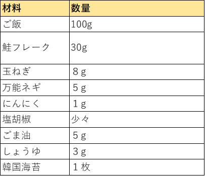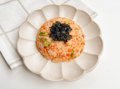 チャーハンにすると食べにくい玉ねぎやねぎも食べやすくなります。また、組み合わせる食材は、定番の卵や焼豚でもOKですが、今回は鮭を使用しました。子どもの骨の成長に必要なたんぱく質やビタミンDがしっかりとれる嬉しい食材です。鮭フレークを使用するので手間もかからず、骨もないので食べやすいですね。にんにくや韓国海苔を組み合わせるのでより食べやすい味付けになっていますよ。(分量の4倍ほどで作った方が作りやすいです)