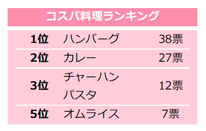 皆様のご家庭の栄養バランスがとれ、嫌いな食材でも食べることができ、簡単に調理することができる料理、”栄養コスパ料理”を聞くと、様々なレシピが集まりました。最も多い回答は「ハンバーグ」となり38票。次いで「カレー」27票、「チャーハン」と「パスタ」が同率の12票、「オムライス」7票となっています。