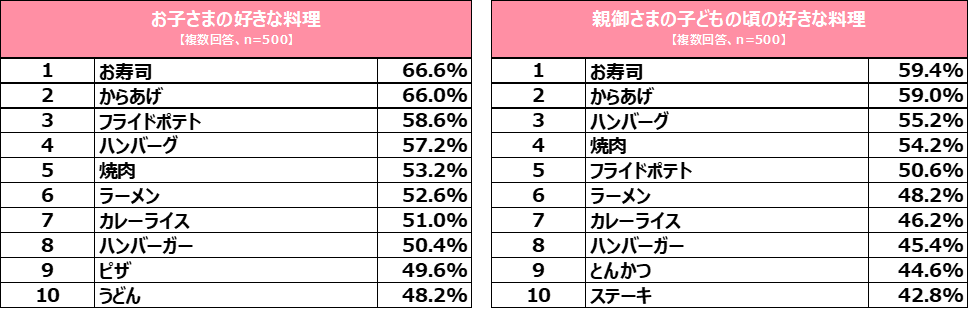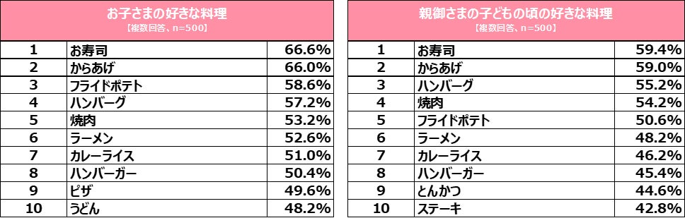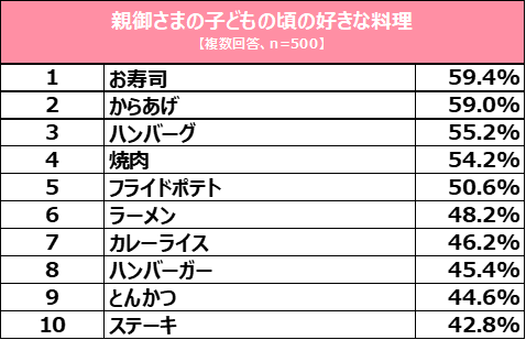 また、親御さまの子どもの頃の好きな料理もお伺いしたところ、1位は「お寿司」で59.4%、2位は「からあげ」で59.0%、3位は「ハンバーグ」で55.2%という結果となりました。