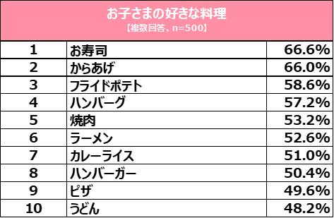 お子さまの好きな料理を聞いたところ、1位は「お寿司」で66.6%、2位は「からあげ」で66.0%、3位は「フライドポテト」で58.6%という結果となっております。
