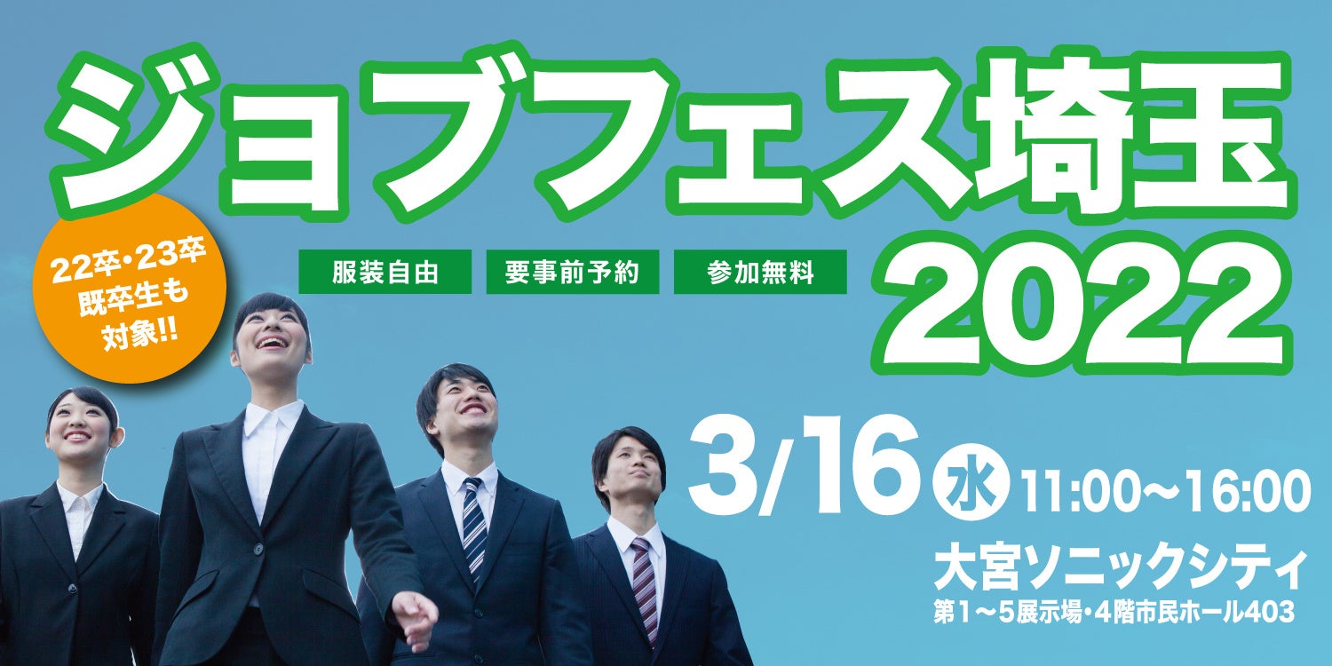 埼玉県は、2022年3月16日(水)11:00〜16:00に大宮ソニックシティにて【ジョブフェス埼玉2022】を開催します。大学生(1~4年生)既卒3年以内の若者、短大生、専門学校生、高専生、高校生、保護者など就職活動に興味のある方ならどなたでも参加いただける、就活に役立つコンテンツが盛りだくさんの、県内最大級の就活イベントです。本イベントは埼玉県からの委託を受けて、株式会社シンミドウが運営します。