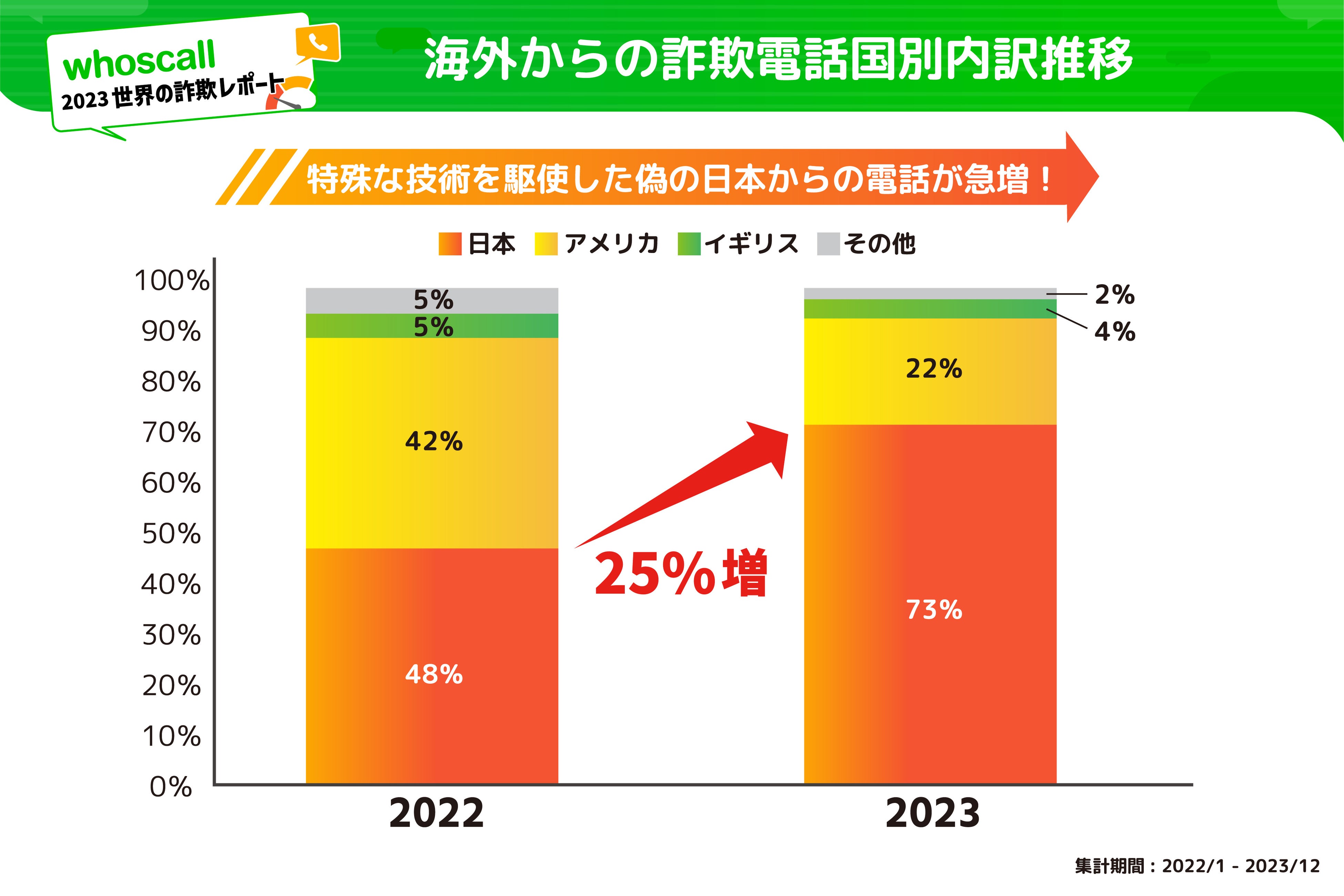海外からの詐欺電話がも増加!Whoscallが日本で検知した詐欺・迷惑電話のうち26%が海外からの着信であることが判明!国際電話番号での発信だけでなく、日本の電話番号を生成し、海外から発信しているケースも