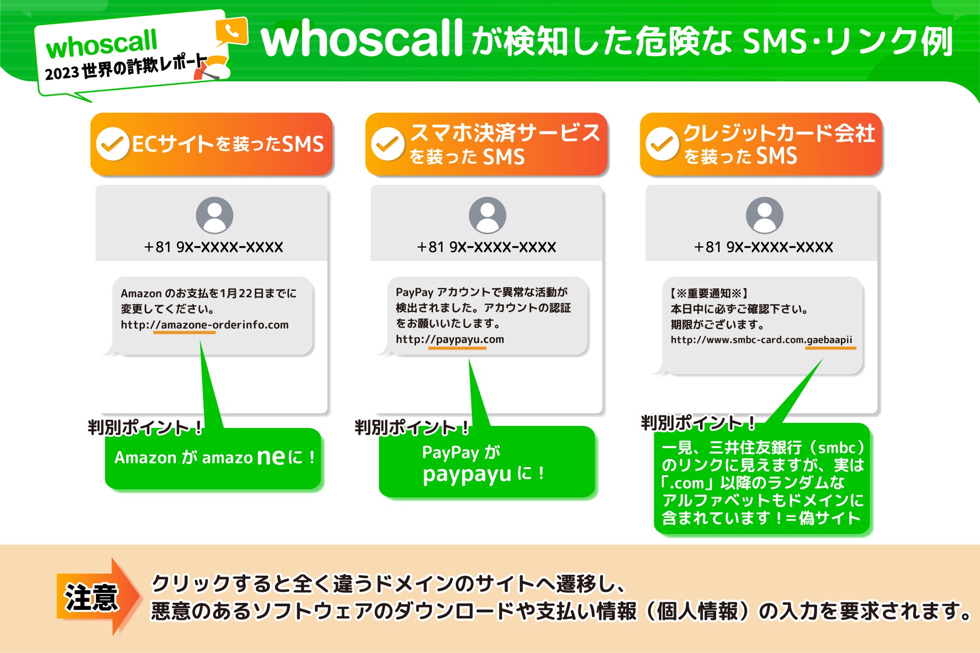 特に日本では、「偽会員サイトのログイン」「悪意のあるソフトウェアダウンロードの誘導」「偽ショッピングサイト」が多く検知されました。具体的には、検知されたドメインの中には、ECサイト「Amazon」や、金融機関「三井住友銀行」、キャッシュレスサービス「PayPay」などを装い、URLも一見本物に見えてしまうようなURLが生成されていることがわかりました。瞬時にメッセージやリンクが偽物かどうかを判断するには、Whoscallのようなアプリを活用していただくことがおすすめです。