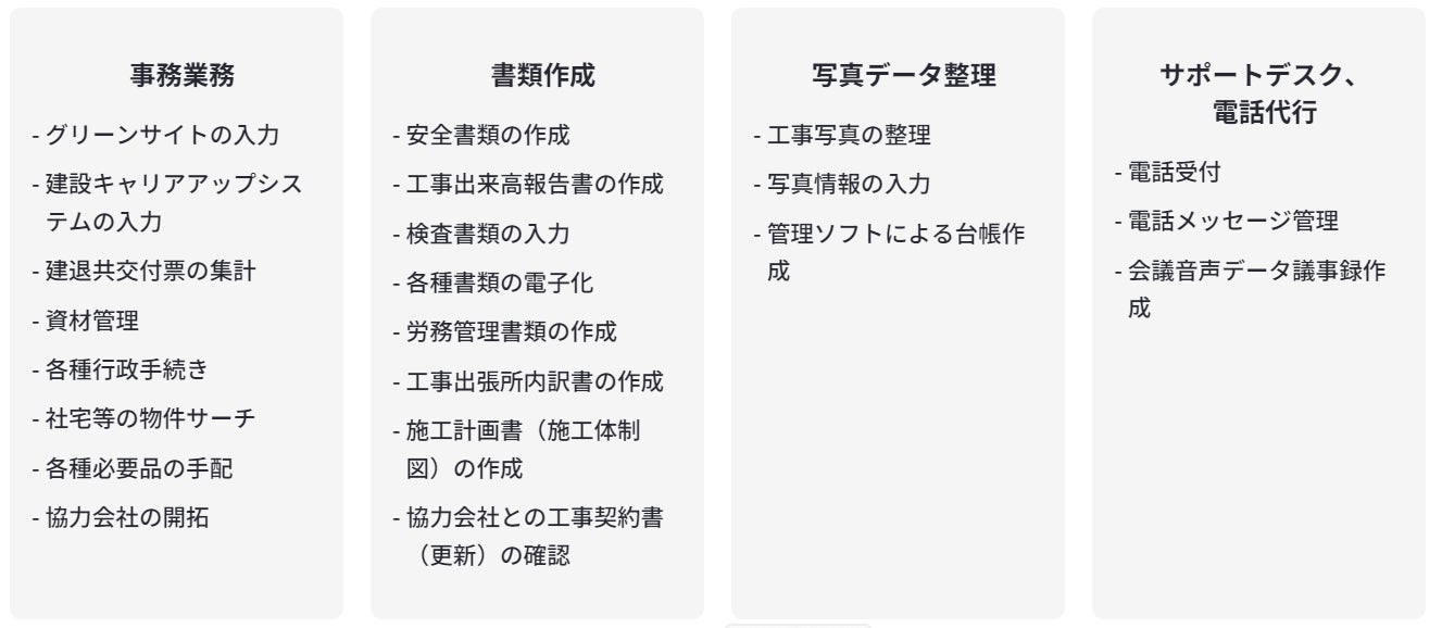 安全書類の作成、工事出来高報告書の作成、検査書類の入力、各種書類の電子化、労務管理書類の作成、工事出張所内訳書の作成、施工計画書(施工体制図)の作成、協力会社との工事契約書(更新)の確認